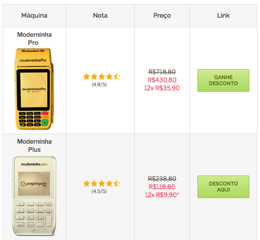 - Foque no conteúdo de avaliações: o site como um todo possui excelentes avaliações e abusa das tabelas e dos call to actions para levar o usuário final a entender quais são as melhores maquininhas para cada nicho e seguir para a o botão de compra.
