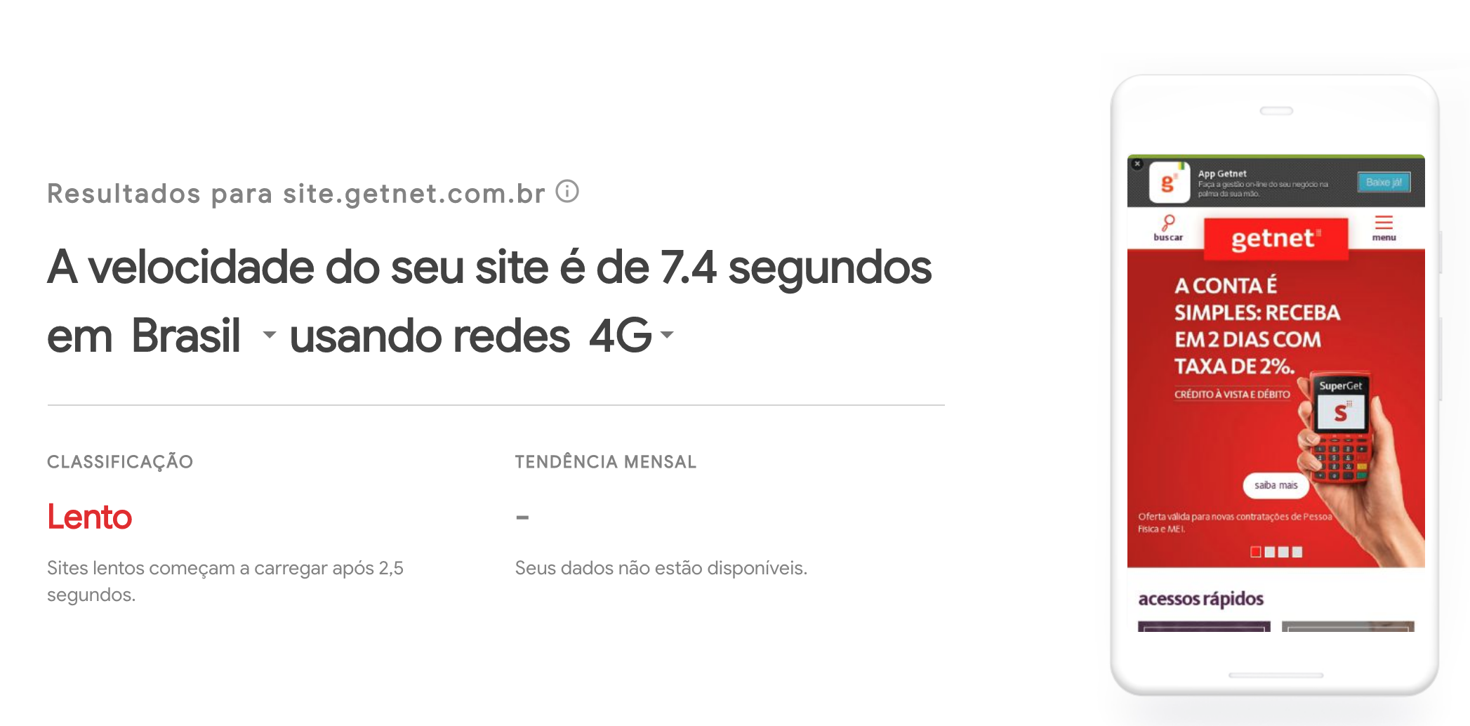 A versão mobile recebeu nota 63 de 100 dentro do Page Speed Insights e foi classificado como “lento”, dentro do relatório da ferramenta Think With Google. Somente a versão desktop que atingiu a pontuação máxima dos testes.