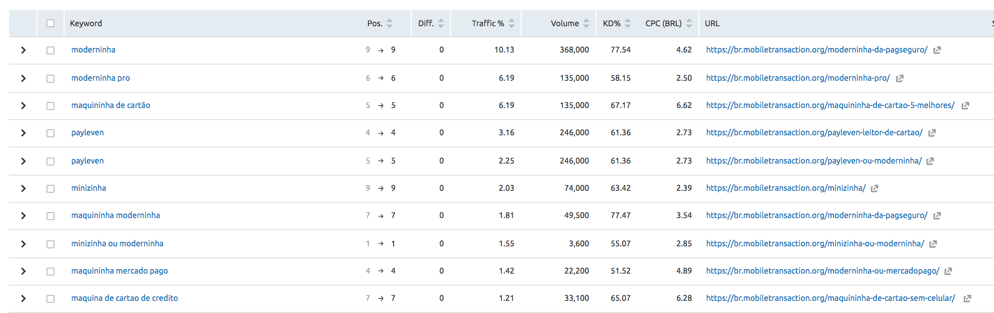 Apesar da quantidade absurda de palavras posicionadas dentro do nicho de máquinas de cartão, quem entende de tráfego do Google sabe que o fator mais importante não é a quantidade mas são seleção correta de palavras que vão levar o tipo mais qualificado de visitas. É assim que o site Mobiletransaction se destaca, veremos abaixo o relatório do SEMRUSH com as palavras chaves com maior potencial de volume de busca e posicionamento:
