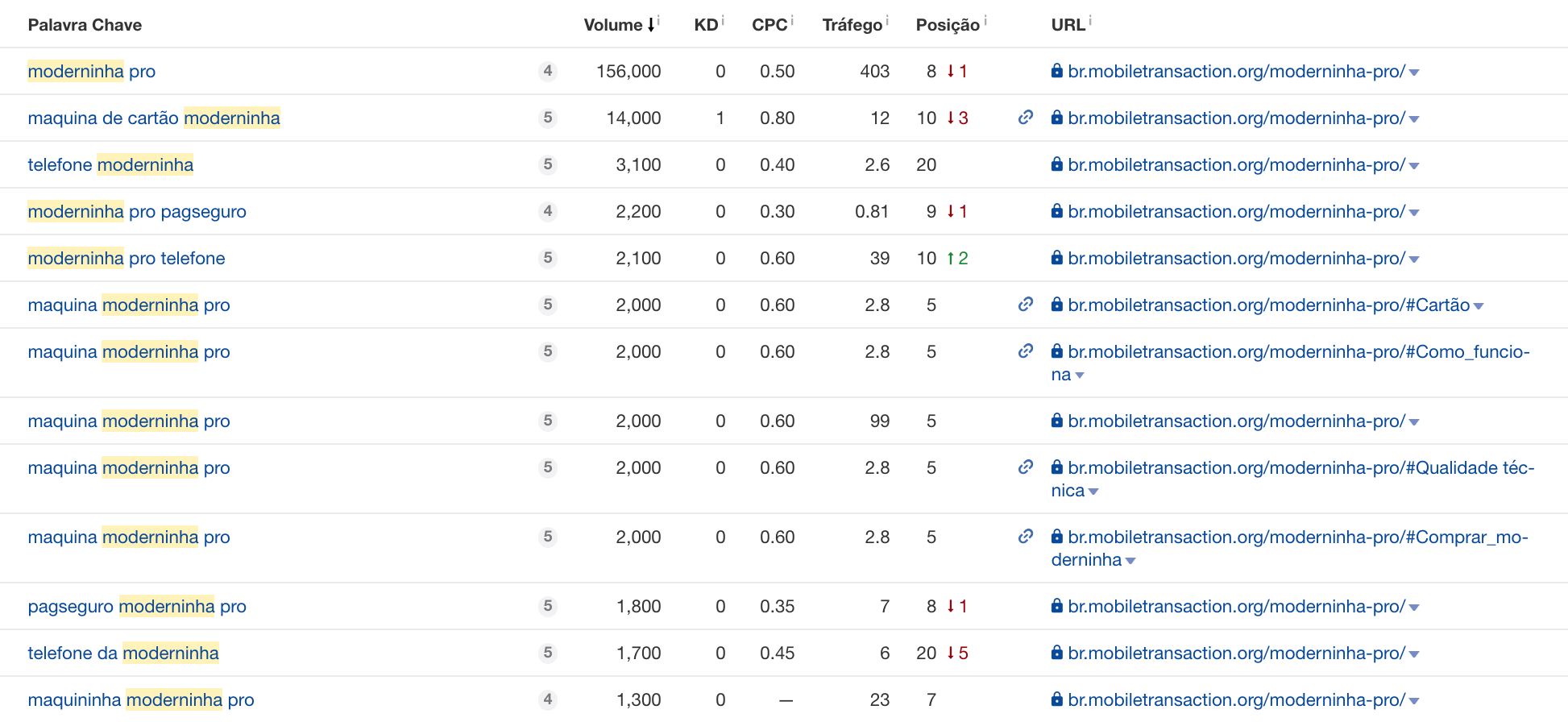 A URL /moderninha-pro está em top 10 no Google para mais de 15 palavras chave relacionadas ao termo “moderninha pro” e captura uma fatia das pessoas que procuram o termo todos os meses, um número que chega na média de 200mil visitas por mês.