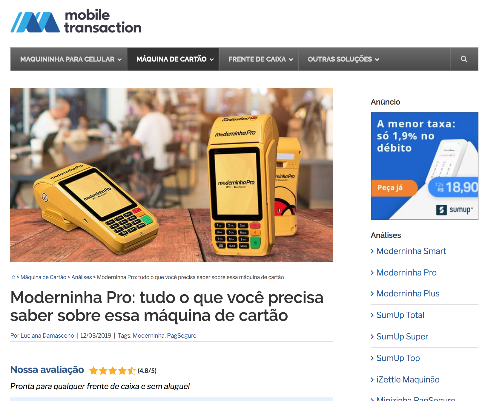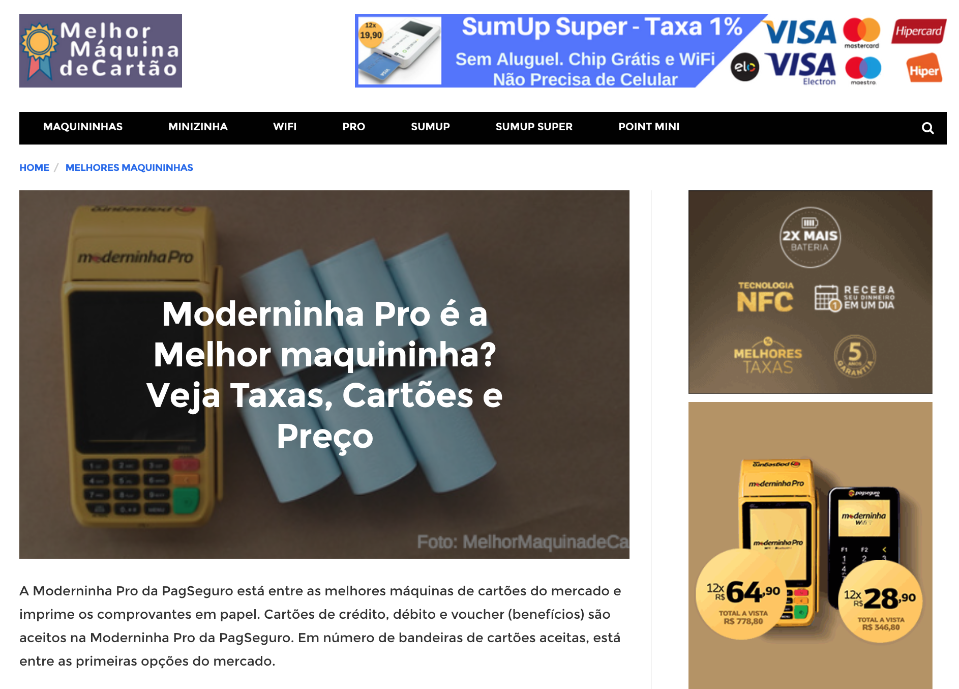 - Foque no conteúdo de avaliações: o site como um todo possui excelentes avaliações e abusa das tabelas e dos call to actions para levar o usuário final a entender quais são as melhores maquininhas para cada nicho e seguir para a o botão de compra.